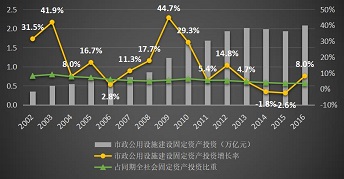 在歷經(jīng)10年的投資高速增長后,市政公用設(shè)施建設(shè)大體完成,2012年之后投資開始進入穩(wěn)定增長通道,近幾年的投資額基本穩(wěn)定在2萬億左右,占同期全社會固定資產(chǎn)投資總額的比例持續(xù)下降。2016年全國市政公用設(shè)施建設(shè)固定資產(chǎn)投資總額為2.1萬億元,占同期全社會固定資產(chǎn)投資總額的3.4%。